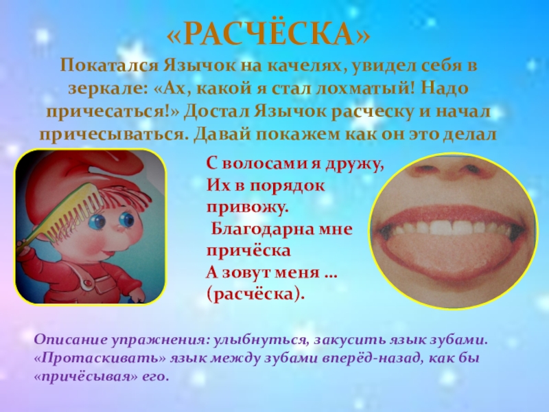 Описание упражнения: улыбнуться, закусить язык зубами. «Протаскивать» язык между зубами вперёд-назад, как бы «причёсывая» его.