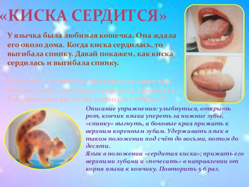 Язык в положении «сердитая киска»; прижать его верхними зубами и «почесать» в направлении от корня языка к кончику. Повторить 5-6 раз.