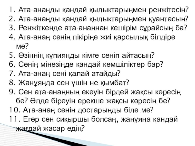 Слайд 111. Ата-анаңды қандай қылықтарыңмен ренжітесің?