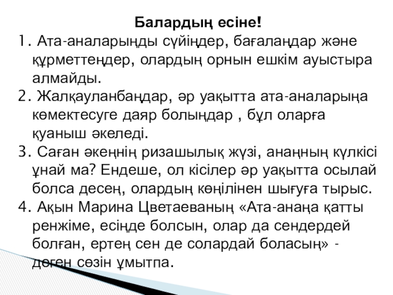 4. Ақын Марина Цветаеваның «Ата-анаңа қатты ренжіме, есіңде болсын, олар да сендердей болған, ертең сен де солардай боласың» - деген сөзін ұмытпа.