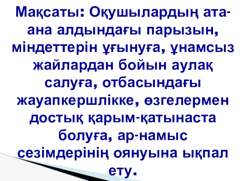 Слайд 2Мақсаты: Оқушылардың ата-ана алдындағы парызын, міндеттерін ұғынуға, ұнамсыз жайлардан бойын аулақ