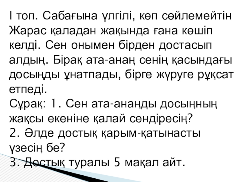 Слайд 6І топ. Сабағына үлгілі, көп сөйлемейтін Жарас қаладан жақында ғана көшіп