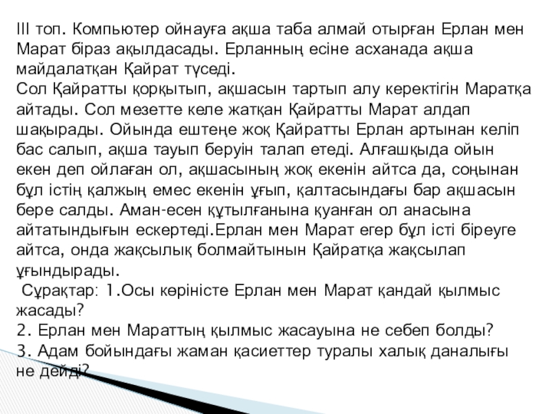 Слайд 8ІІІ топ. Компьютер ойнауға ақша таба алмай отырған Ерлан мен Марат