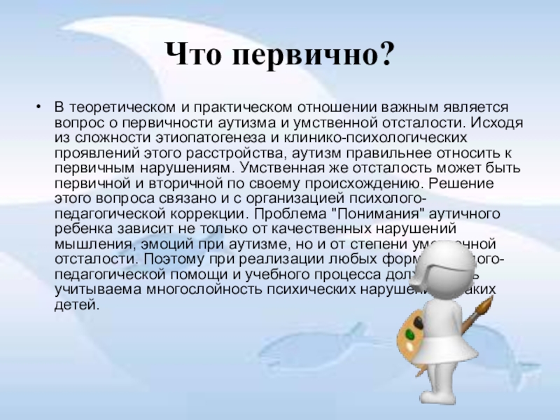 аутизма и умственной отсталости. Исходя из сложности этиопатогенеза и клинико-психологических проявлений этого расстройства, аутизм правильнее относить к первичным нарушениям. Умственная же отсталость может быть первичной и вторичной по своему происхождению. Решение этого вопроса связано и с организацией психолого-педагогической коррекции. Проблема "Понимания" аутичного ребенка зависит не только от качественных нарушений мышления, эмоций при аутизме, но и от степени умственной отсталости. Поэтому при реализации любых форм психолого-педагогической помощи и учебного процесса должна быть учитываема многослойность психических нарушений у таких детей.