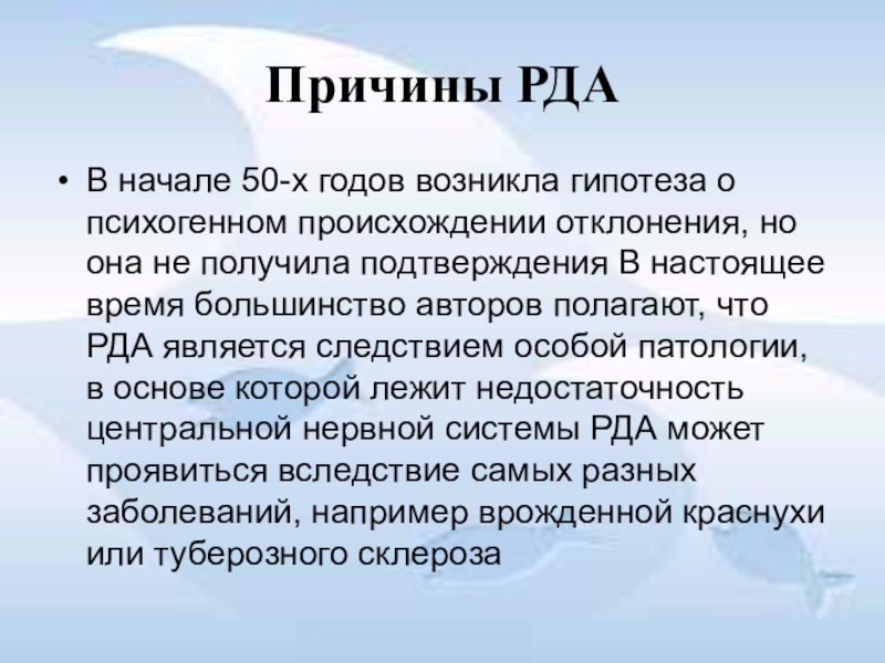 но она не получила подтверждения В настоящее время большинство авторов полагают, что РДА является следствием особой патологии, в основе которой лежит недостаточность центральной нервной системы РДА может проявиться вследствие самых разных заболеваний, например врожденной краснухи или туберозного склероза