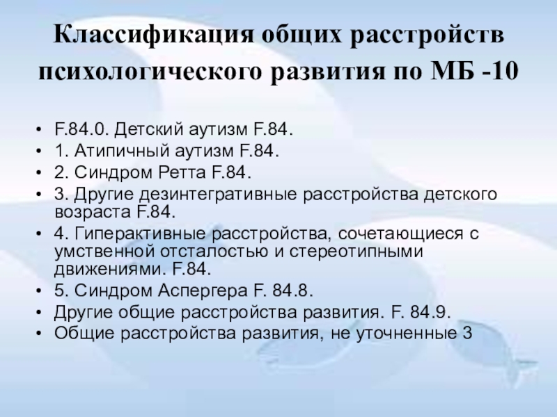Слайд 9Классификация общих расстройств психологического развития по МБ -10