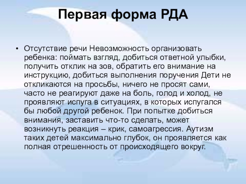 улыбки,получить отклик на зов, обратить его внимание на инструкцию, добиться выполнения поручения Дети не откликаются на просьбы, ничего не просят сами, часто не реагируют даже на боль, голод и холод, не проявляют испуга в ситуациях, в которых испугался бы любой другой ребенок. При попытке добиться внимания, заставить что-то сделать, может возникнуть реакция – крик, самоагрессия. Аутизм таких детей максимально глубок, он проявляется как полная отрешенность от происходящего вокруг.