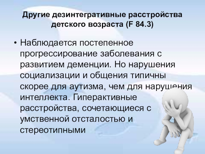 Слайд 12Другие дезинтегративные расстройства детского возраста (F 84.3)