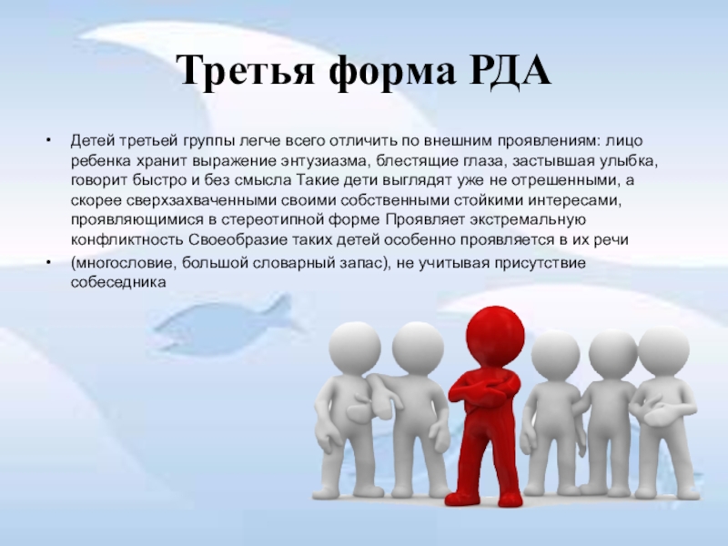 лицо ребенка хранит выражение энтузиазма, блестящие глаза, застывшая улыбка, говорит быстро и без смысла Такие дети выглядят уже не отрешенными, а скорее сверхзахваченными своими собственными стойкими интересами, проявляющимися в стереотипной форме Проявляет экстремальную конфликтность Своеобразие таких детей особенно проявляется в их речи