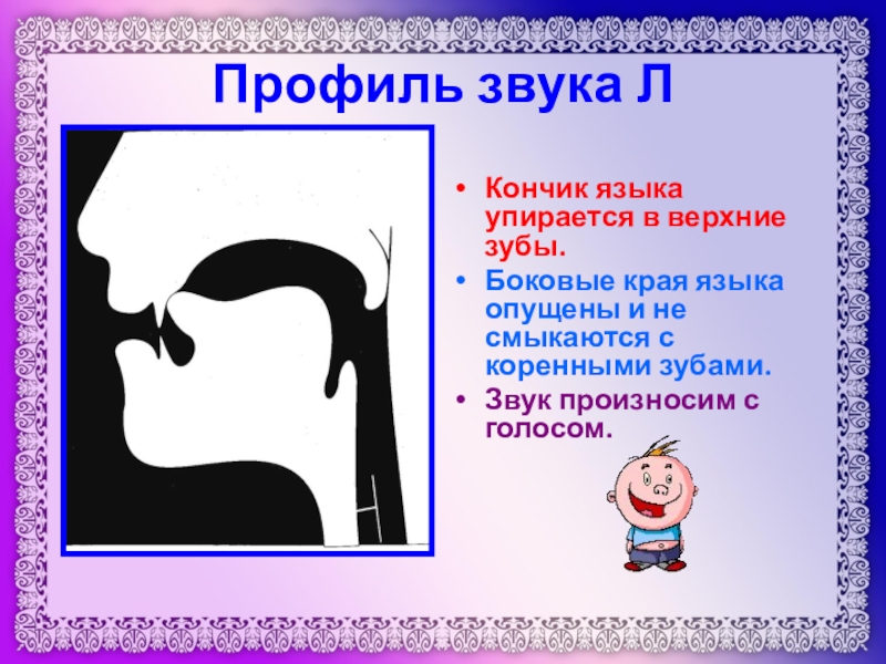 Профиль звука ЛКончик языка упирается в верхние зубы.Боковые края языка опущены и не смыкаются с коренными зубами. Звук произносим с голосом.
