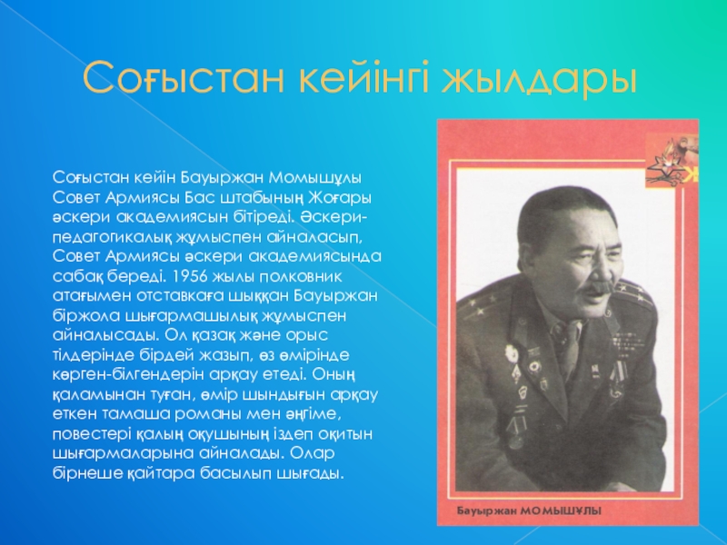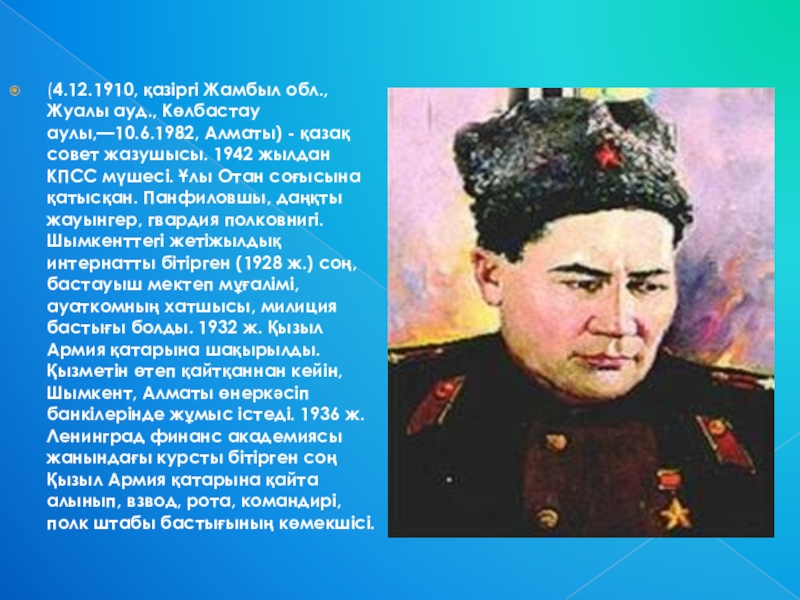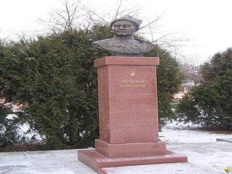 Биік ірге тасты қолында қылышы бар ұлы тұлға, айбынды жауынгер, философ интернационалист, жазушы. Екінші шешуші дүние жүзілік соғыстың батырының ескерткішінен халық көптеген ұрпақтың айбынды батырларының бейнесін көреді. Ол каһарлы соғыс мектебінен өткен ажал көзіне бірнеше рет қараған, әр ұлттың жауынгерін жеңіске жету мақсатында тәрбиелеген. Ол үнемі үкімет оппозиясында болып, өзінің тәуелсіз мінезімен, әділетсіздікті сынап отырған