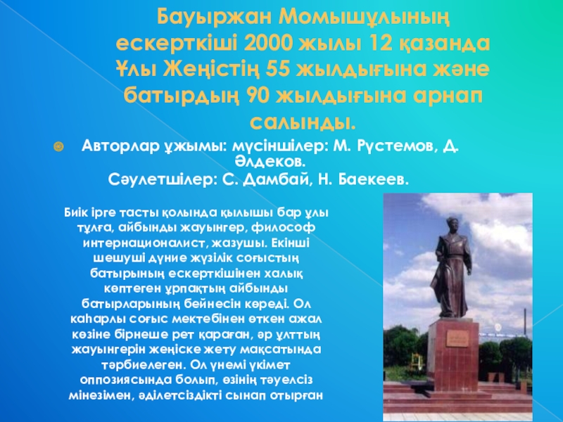 Авторлар ұжымы: мүсіншілер: М. Рүстемов, Д. Әлдеков.