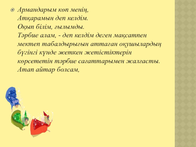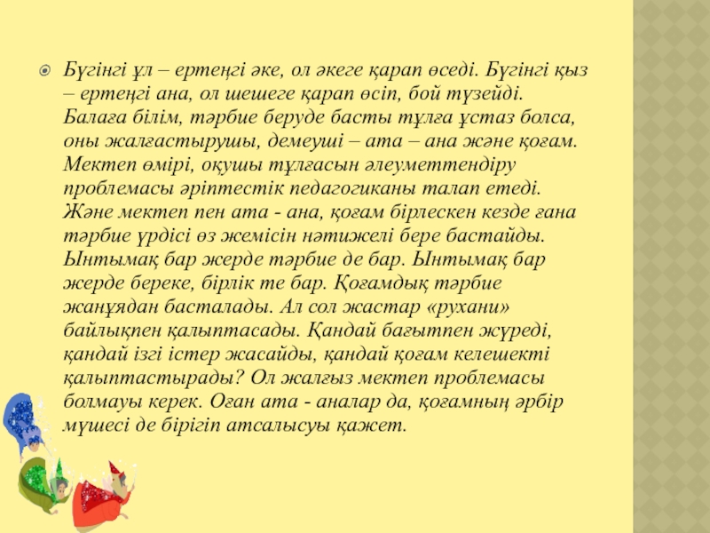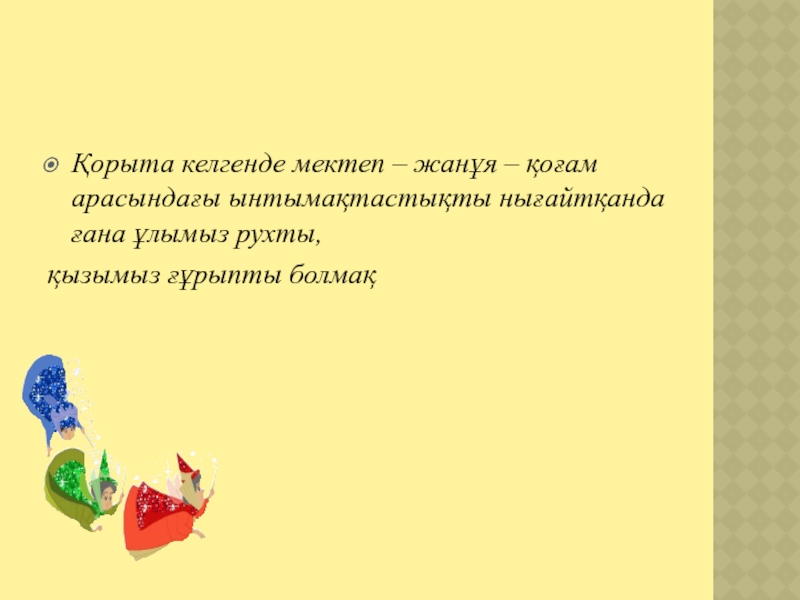 арасындағы байланысты нығайту арқылы, отбасы тәрбиесінің типтерімен таныстыру және бала тәрбиесіндегі ата - аналардың қолданып жүрген әдістерінің нәтижелеріне көңіл аударту. Бала тәрбиесіне отбасы мен мектеп арасындағы қарым - қатынасты нығайтуды дамыту.