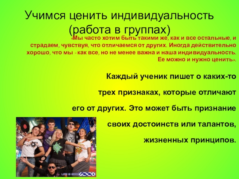 Слайд 17Учимся ценить индивидуальность (работа в группах)