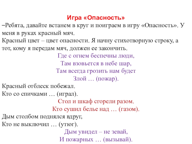 Игра «Опасность»–Ребята, давайте встанем в круг и поиграем в игру «Опасность». У меня в руках красный мяч. Красный цвет – цвет опасности. Я начну стихотворную строку, а тот, кому я передам мяч, должен ее закончить.Где с