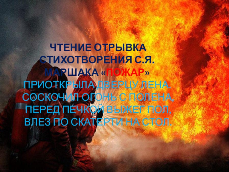 Слайд 5 Чтение отрывка стихотворения С.Я.Маршака «Пожар» Приоткрыла дверцу Лена. Соскочил огонь