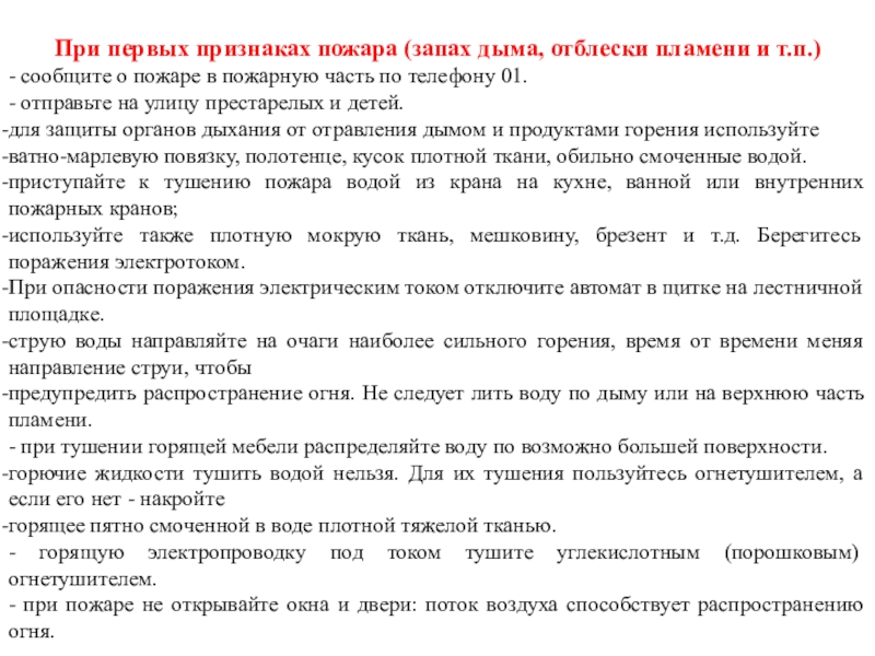 При первых признаках пожара (запах дыма, отблески пламени и т.п.)- сообщите о пожаре в пожарную часть по