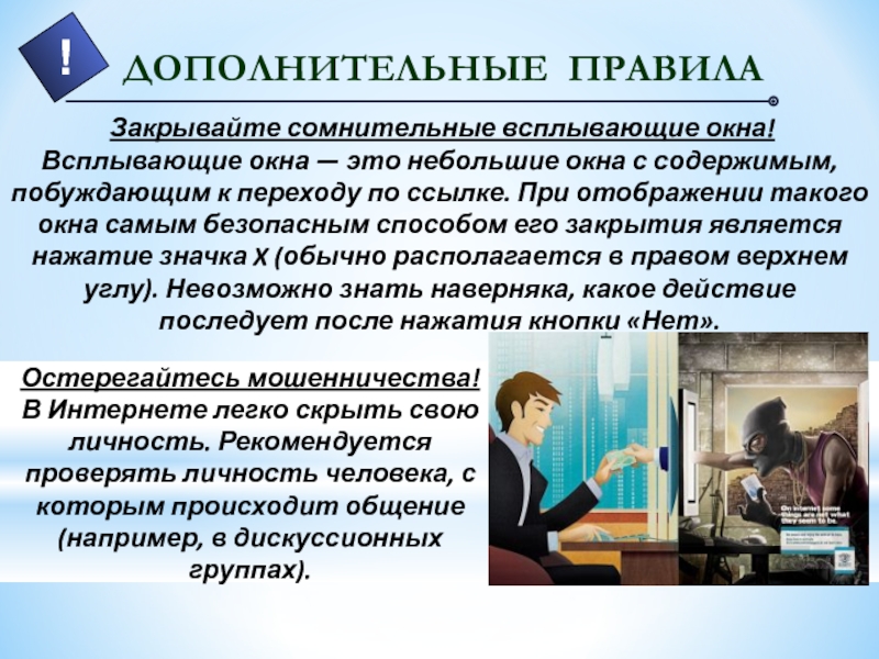 В Интернете легко скрыть свою личность. Рекомендуется проверять личность человека, с которым происходит общение (например, в дискуссионных группах).