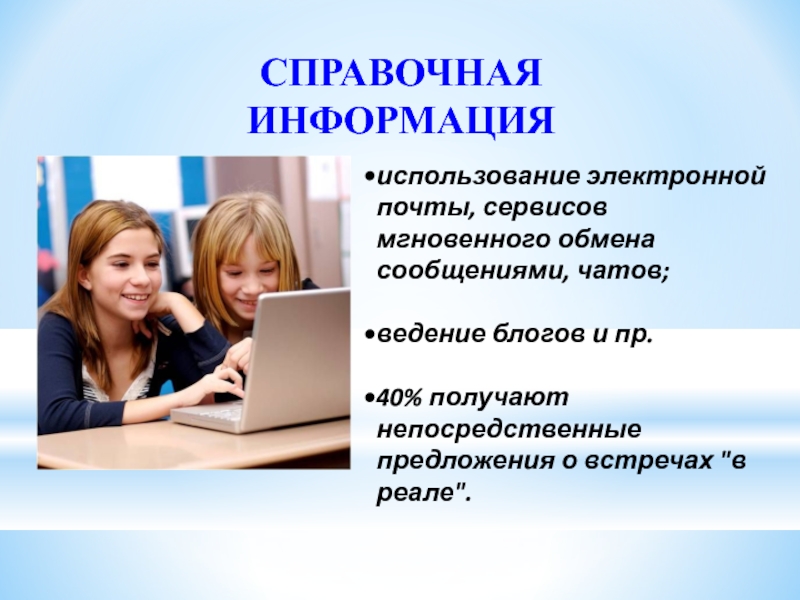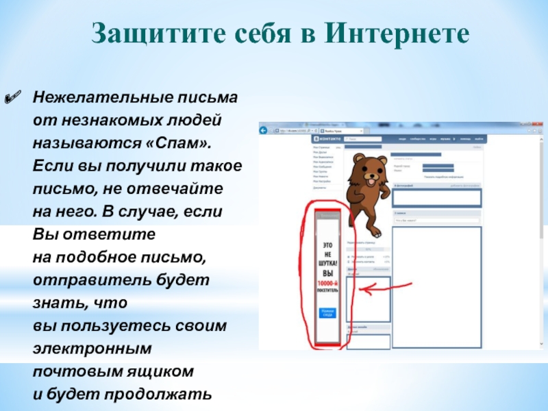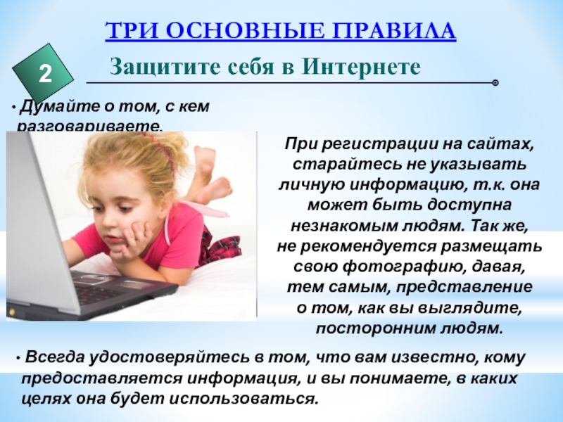 При регистрации на сайтах, старайтесь не указывать личную информацию, т.к. она может быть доступна незнакомым людям. Так же, не рекомендуется размещать свою фотографию, давая, тем самым, представление о том, как вы выглядите, посторонним людям.