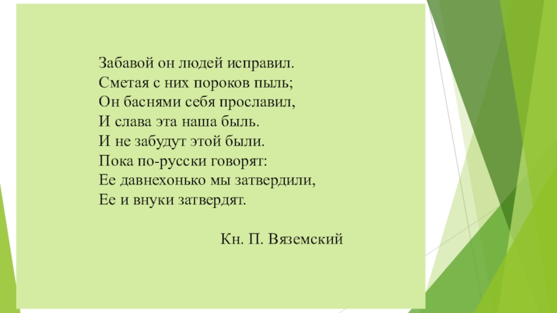 Забавой он людей исправил. Сметая с них пороков пыль; Он баснями себя прославил, И слава эта наша быль. И не забудут этой были. Пока по-русски говорят: Ее давнехонько мы затвердили, Ее и внуки затвердят. Кн. П.