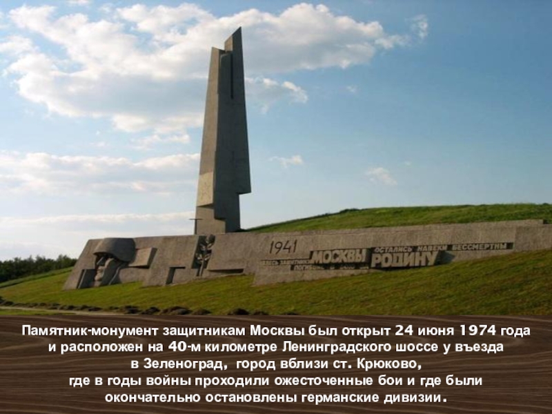 Слайд 24Памятник-монумент защитникам Москвы был открыт 24 июня 1974 года