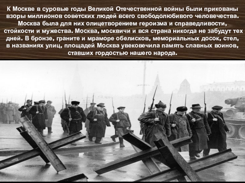 Слайд 29К Москве в суровые годы Великой Отечественной войны были прикованы взоры миллионов