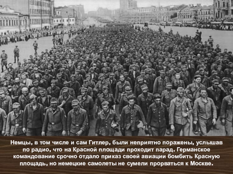 на Красной площади проходит парад. Германское командование срочно отдало приказ своей авиации бомбить Красную площадь, но немецкие самолеты не сумели прорваться к Москве.