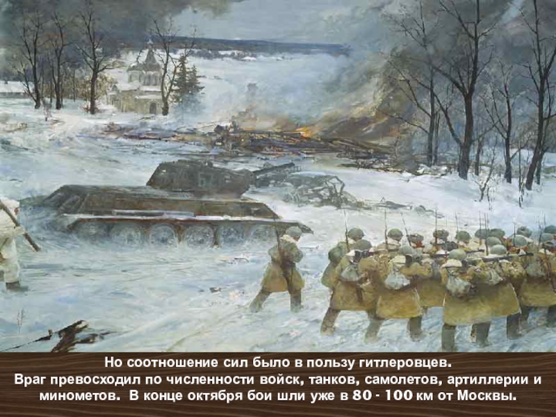 Враг превосходил по численности войск, танков, самолетов, артиллерии и минометов. В конце октября бои шли уже в 80 - 100 км от Москвы.