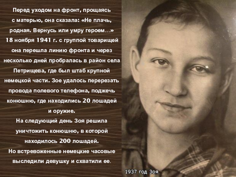Слайд 52Перед уходом на фронт, прощаясь с матерью, она сказала: «Не плачь, родная. Вернусь или