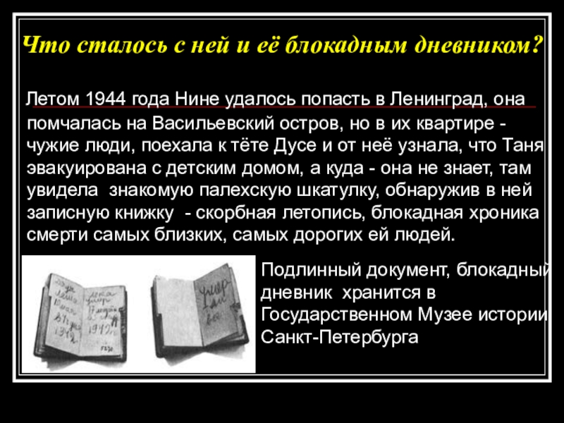 Подлинный документ, блокадный дневник хранится в Государственном Музее истории Санкт-Петербурга