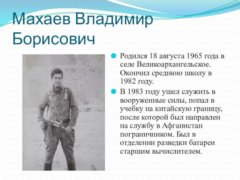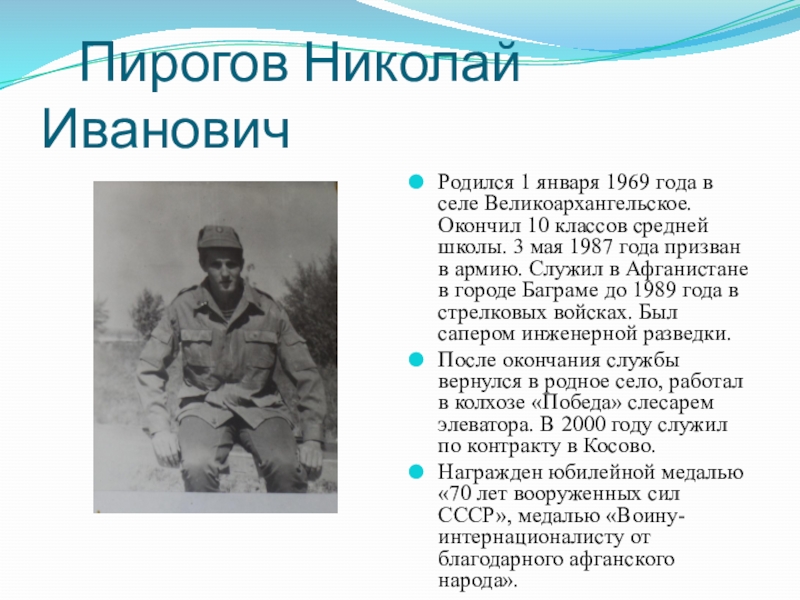 республике Афганистан с августа 1986 года. Служил в военной части ПП 71176 г. Кандагар в 70-й отдельной мотострелковой бригаде.