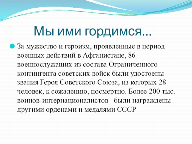 в период военных действий в Афганистане, 86 военнослужащих из состава Ограниченного контингента советских войск были удостоены звания Героя Советского Союза, из которых 28 человек, к сожалению, посмертно. Более 200 тыс. воинов-интернационалистов были награждены другими орденами и медалями СССР