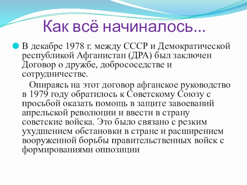 СССР и Демократической республикой Афганистан (ДРА) был заключен Договор о дружбе, добрососедстве и сотрудничестве.