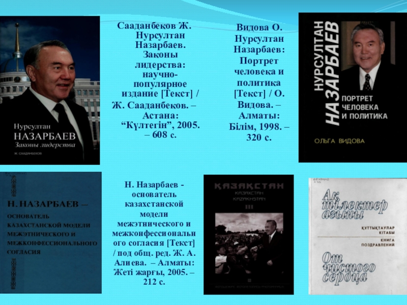 Н. Назарбаев - основатель казахстанской модели межэтнического и межконфессионального согласия [Текст] / под общ. ред. Ж. А. Алиева. – Алматы:Жеті жарғы, 2005. – 212 с.