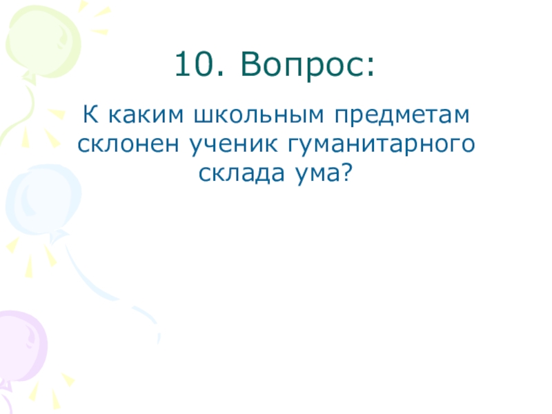 10. Вопрос:К каким школьным предметам склонен ученик гуманитарного склада ума?