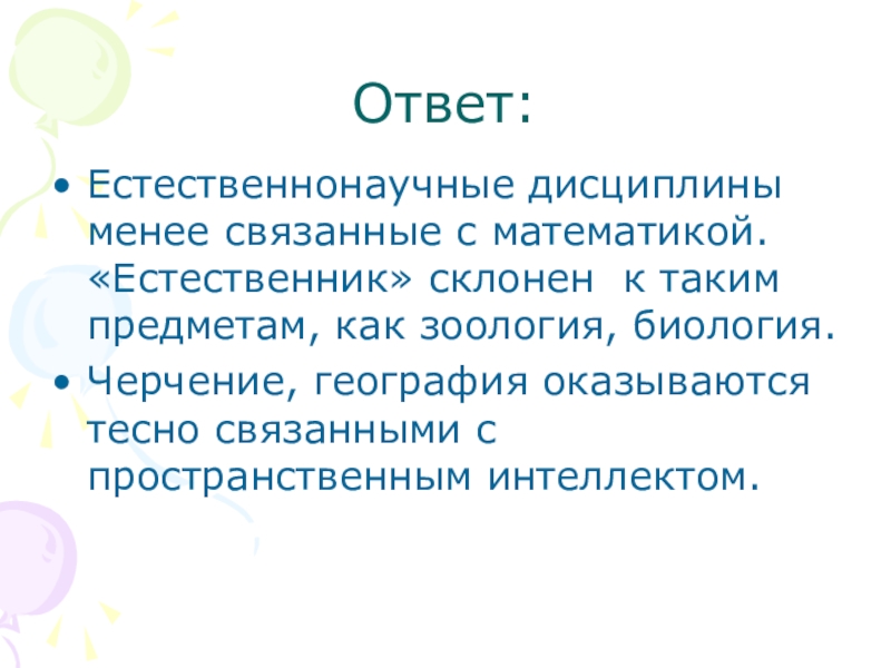 Ответ:Естественнонаучные дисциплины менее связанные с математикой. «Естественник» склонен к таким предметам, как зоология, биология.Черчение, география оказываются тесно