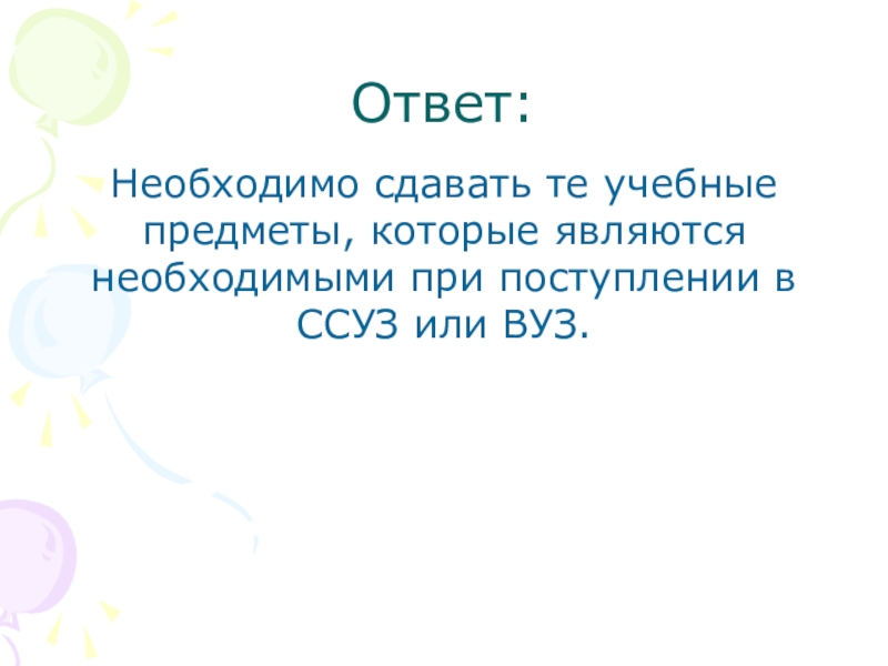 Ответ:Необходимо сдавать те учебные предметы, которые являются необходимыми при поступлении в ССУЗ или ВУЗ.
