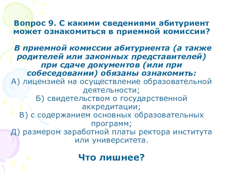 Слайд 12Вопрос 9. С какими сведениями абитуриент может ознакомиться в приемной комиссии?