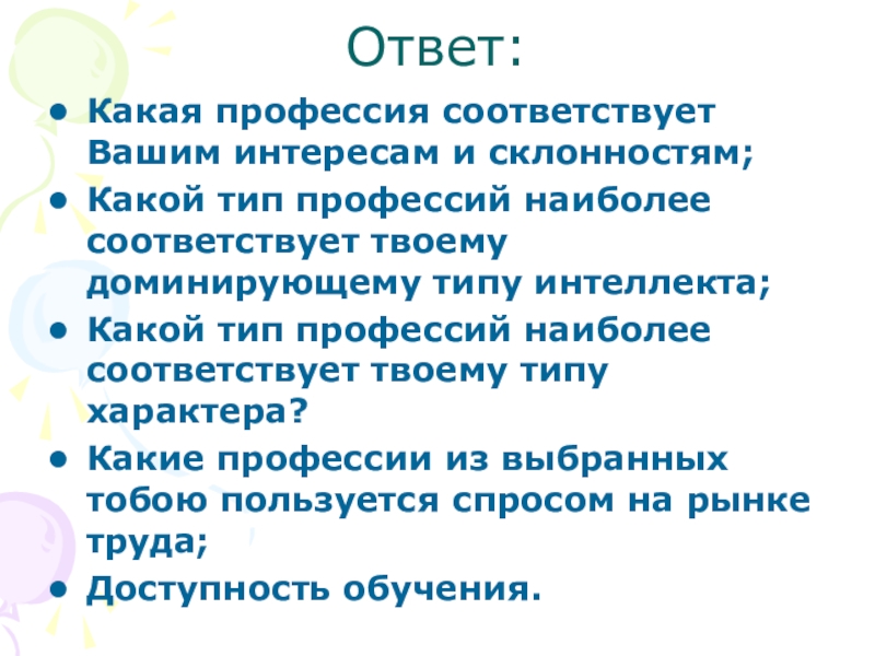 Ответ:Какая профессия соответствует Вашим интересам и склонностям;Какой тип профессий наиболее соответствует твоему доминирующему типу интеллекта;Какой тип профессий