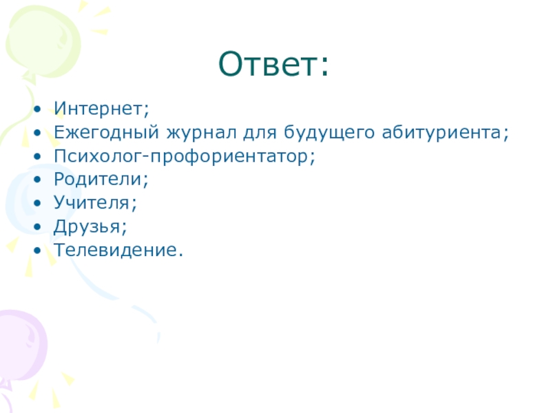 Ответ:Интернет;Ежегодный журнал для будущего абитуриента;Психолог-профориентатор;Родители;Учителя;Друзья;Телевидение.