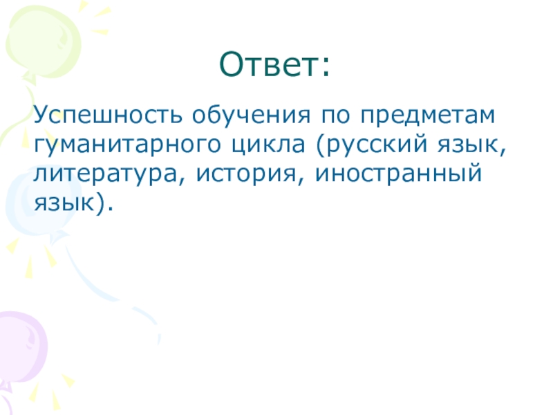 Ответ:Успешность обучения по предметам гуманитарного цикла (русский язык, литература, история, иностранный язык).