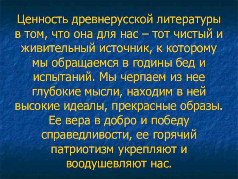 Ценность древнерусской литературы в том, что она для нас – тот чистый и живительный источник, к которому