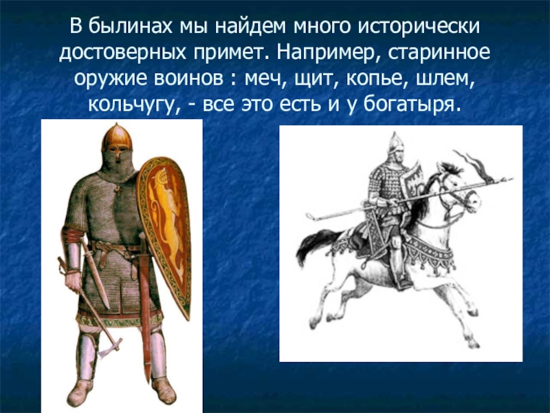 Слайд 8В былинах мы найдем много исторически достоверных примет. Например, старинное оружие