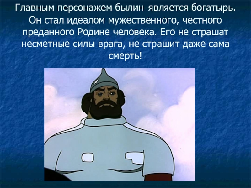 Слайд 5Главным персонажем былин является богатырь. Он стал идеалом мужественного, честного преданного