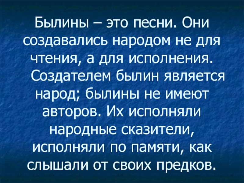 Былины – это песни. Они создавались народом не для чтения, а для исполнения. Создателем былин является народ; былины не имеют авторов. Их исполняли народные сказители, исполняли по памяти, как слышали от своих предков.