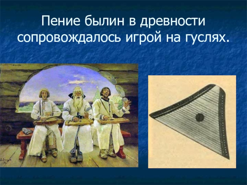 Слайд 15Пение былин в древности сопровождалось игрой на гуслях.