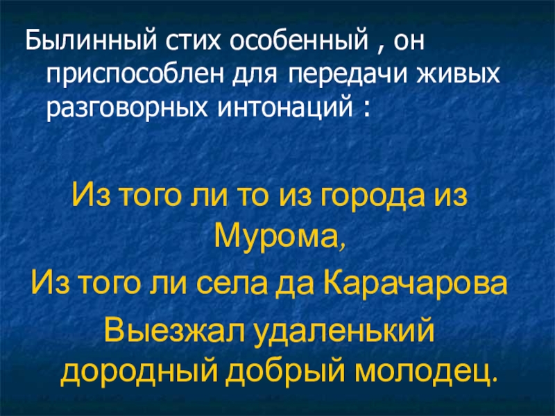Слайд 13Былинный стих особенный , он приспособлен для передачи живых разговорных интонаций