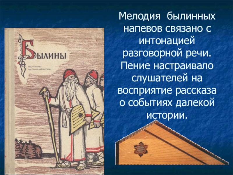Слайд 14Мелодия былинных напевов связано с интонацией разговорной речи. Пение настраивало слушателей