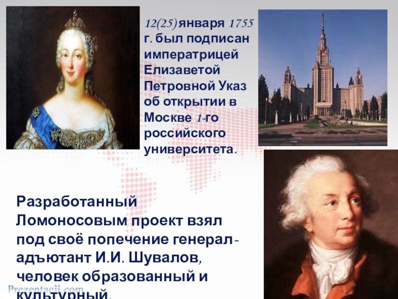 Разработанный Ломоносовым проект взял под своё попечение генерал-адъютант И.И. Шувалов, человек образованный и культурный.