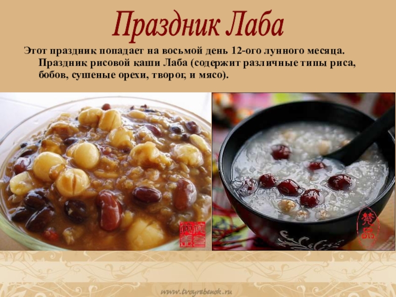 Слайд 8Этот праздник попадает на восьмой день 12-ого лунного месяца. Праздник рисовой